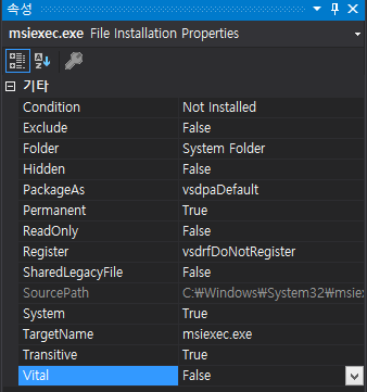 msiexec.exe 파일이 등록된것을 봤으면.. 선택 후 우측 속성창에서 속성을 변경 해주자.
