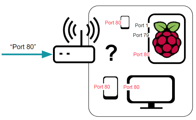 내 의도는 '(OctoPrint 가 설치된 라즈베리 파이의) Port 80'으로 접근해달라는 것이었지만, 앞의 수식어를 다 생략하고 'Port 80'만 요청을 했기 때문에 공유기 입장에서는 특정을 할 수가 없는 요청이 됩니다.