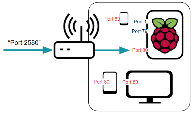 Port 180 으로 진입 시 핸드폰의 Port 80 으로, Port 2580 으로 진입 시 라즈베리 파이의 Port 80 으로, Port 3830 으로 진입 시 태블릿의 Port 80 으로 요청을 전달하는 식으로 사용자의 편의 대로 전달(Forwarding)설정을 하는 것이 가능합니다.